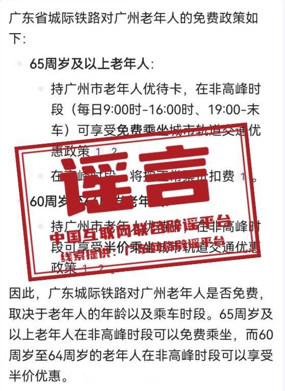 真相:2024年5月,一张《广东省城际铁路对广州老年人的免费政策》截图在社交网络流传,其内容显示“广州老年人持优待卡在非高峰期搭广东城际可享受半价或免费优惠”,引发关注。