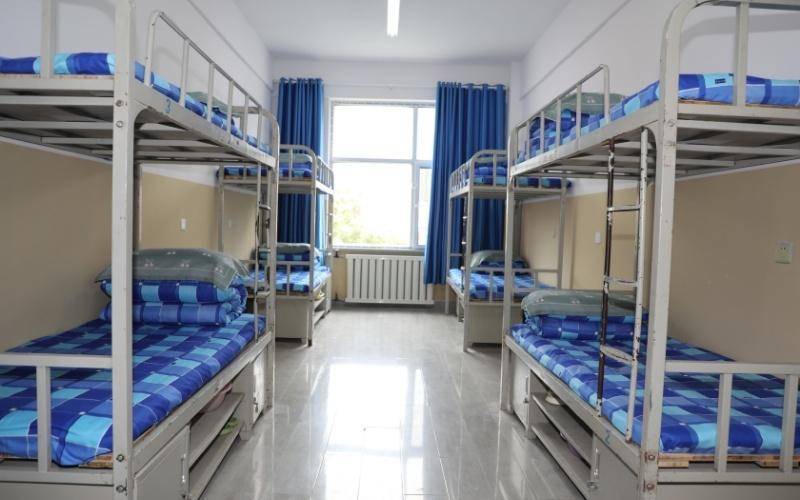 “床单、被套、枕巾都是免费发给我们的,颜色统一又好看,新校园充满了新期待。”跟着安玉琴的脚步,我们来到了女生宿舍,上下高低床,干净整洁的环境,出门就有得淋浴间和卫生间,方便又快捷。